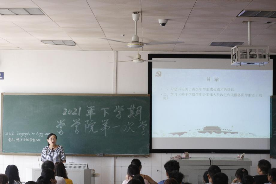 团委书记唐升老师带领学院学生干部们一起学习了习近平总书记关于青少年学生成长成才的讲话精神内涵和《关于学联学生会工作人员改进作风服务同学的若干规定》的文件。她希望学生干部们不辜负习近平总书记对青年学生的殷切希望,在脚踏实地、埋头苦干、砥砺奋斗中为实现中华民族伟大复兴贡献力量!最后,唐升老师嘱咐学生干部们要有干部身份意识,勤奋学习,吃苦耐劳,谨言慎行,着力营造积极向上、甘于奉献、风清气正的学生干部团队氛围。