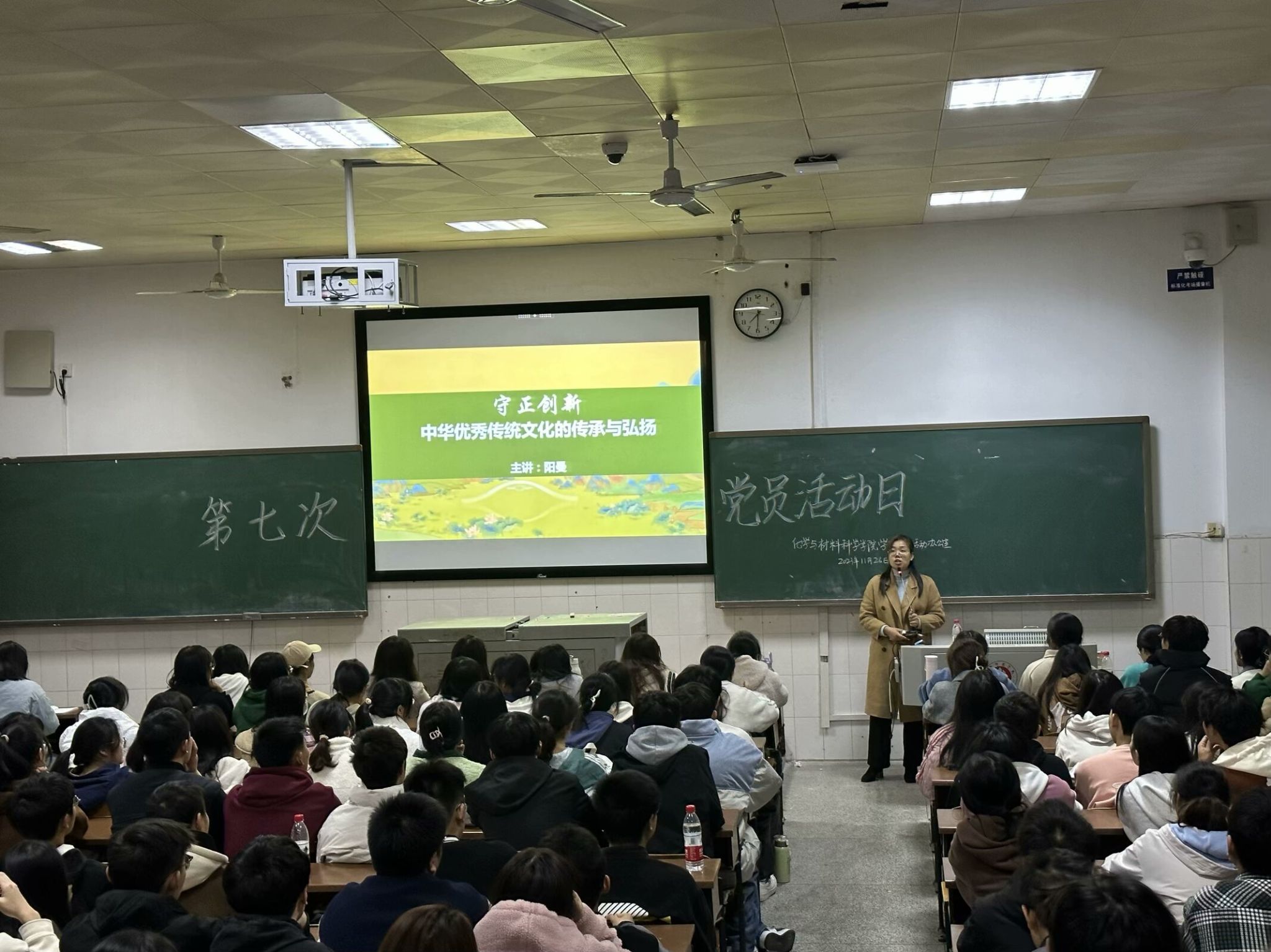 2023年11月26日晚,PA视讯平台本学期第七次党员活动日讲座在行知楼601进行,院党总支书记阳曼老师以《守正创新,中优秀传统文化的传承与弘扬》为题为全体学生党员和入党积极分子授课