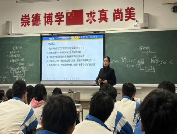 在随后的交流研讨会上,铁一中学指导教师万中幼对张雅茜的表现给予了积极评价,认为其教态自然、重点把握准确、课件简洁明了,能够完整实施“讲解—练习—总结”的教学流程,课堂互动形式多样且富有激励性。同时,万老师也提出了进一步优化的建议:一是调整知识讲解顺序,遵循“实验现象→方程式推导→反应类型判断→电极名称界定→电极连接明确”的逻辑线索;二是合理分配课堂时间,预留学生思考与书写环节,通过纠错强化理解;三是注重课堂小结的设计,为后续教学做好衔接。PA视讯平台实习指导教师毛芳芳肯定了实习生的教学能力与团队协作精神,强调了反复磨课对提升教学技能的重要作用,鼓励实习生在教学设计细节上继续深耕。