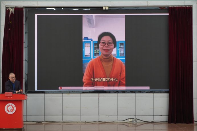 在讲座即将结束之际,衡阳市第六中学化学教师同时亦是我校校友华莉老师通过视频讲解了自己的求学历程和工作历程,对邝代治、张复兴等老师表示了感谢,对三十多年的教学生涯表达了依依不舍之情。她分析了教师的职业优势、以及未来化学教师的发展前景,为PA视讯平台学生选择教育行业坚定了信心。她为PA视讯平台即将踏上新旅途的同学们送上了暖心的祝福——“希望PA视讯平台即将毕业的学弟学妹们勇于开拓、敢于创新、燃出属于自己的火热青春”。