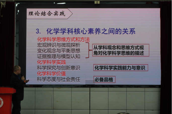 刘剑老师接着向我们展开讲述了化学学科核心素养的培养途径。他从核心素养、真实情景、实际问题、化学知识等要素之间的相互关系进行了讲解。通过从无情景化到真实情景、从碎片到结构、从知识到知识(语言和思维)、从做题到做事、从封闭到开发、从标量到向量这几个方面的重点阐释,刘剑老师认为在核心素养时代下的教学评价标准是“教师能将知识与现实建立联系,将知识结构化。同时也能在自己的教学中培养学生自主将知识结构化的能力。”