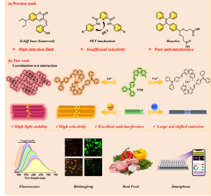 在另一篇题为"J-aggregate fluorescence probe constructed based on AIE units for analysis of Zn2+, Cu2+ ions in food and biological systems"的研究中,团队基于聚集诱导发光(AIE)单元,开发了一种新型J聚集荧光探针PTD,实现了对锌离子(Zn2+)和铜离子(Cu2+)的高灵敏度、高选择性检测。该探针检测限分别达到15 nM(Zn2+)和0.503 nM(Cu2+),成功应用于食品样品、环境水体中重金属离子的半定量分析及活细胞成像检测。