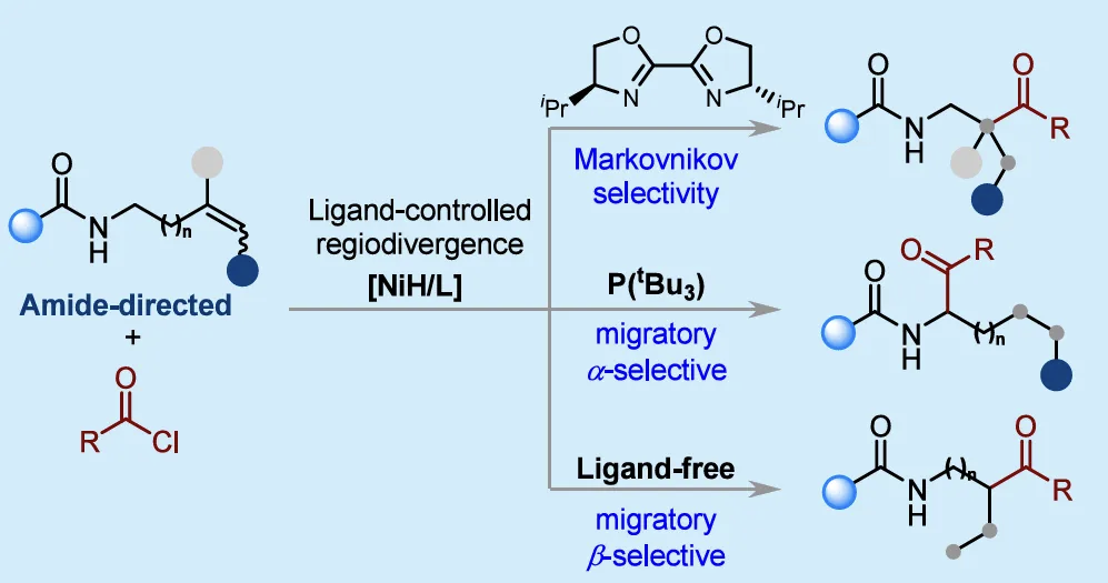 该论文是国家自然科学基金、湖南省教育厅基金等资助的重要成果之一,由李文艺教授和王超教授共同指导完成。衡阳师范学院为第一署名单位,冯浙泰为论文共同第一作者。论文研究结果表明:我们开发了一种由配体控制、酰胺导向的镍催化反应体系,可实现未活化烯烃与易得酰氯的氢酰化反应,从而能够通过区域发散性合成获得结构多样的支链酮类化合物。通过合理的配体调控,该策略既可保持马氏选择性(Markovnikov selectivity),又能实现迁移型α/β选择性。该反应在温和条件下进行,具有广泛的底物适用范围,且能兼容多种官能团。我们预计,这一高效稳定且具有模块化特点的实验方案将在合成有机化学领域得到广泛应用,尤其可用于高效制备含酮类骨架的化合物,为药物研发提供支持。