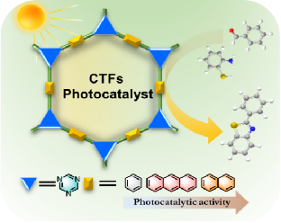 苯并噻唑类化合物在药物研发领域具有广泛应用前景,但其可持续合成仍面临挑战。虽然共价三嗪结构(CTFs)作为可见光响应型光催化剂在氧化反应中展现出巨大潜力,但其效率常受强激子束缚效应和低效电荷分离的影响。因此,我们通过将供体单元从苯改为萘和蒽,同时保持三嗪受体核心,开发了一系列CTF(CTF-1至CTF-3)。实验结果表明,萘桥联的CTF-2在π离域和骨架平面性之间实现了最佳平衡,显示出最高的光催化活性(苯并噻唑产率为99%)。理论计算进一步表明,CTF-2具有增强的共面性和扩展的前线轨道离域性,可以协同增强激子离解和载流子迁移率。