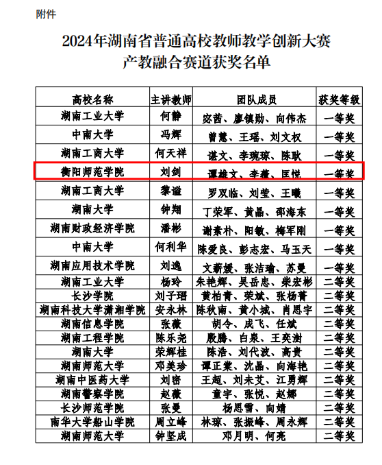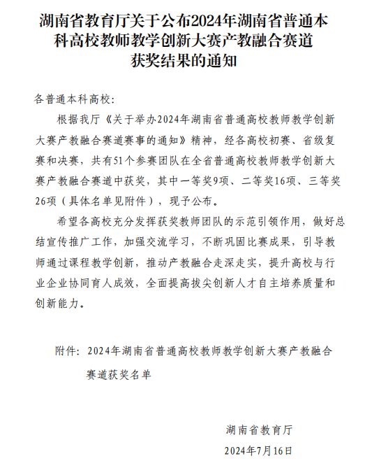 7月13日,由湖南省教育厅主办的第四届湖南省普通高校教师教学创新大赛产教融合赛道现场决赛在南华大学圆满落幕。PA视讯平台刘剑老师负责的《化工原理》课程团队代表学校参赛,喜获一等奖。这是继PA视讯平台毛芳芳教师团队在2023年第三届湖南省普通高校教师教学创新大赛中荣获一等奖后,再次获此殊荣,反映了PA视讯平台在推动课程改革、提高教师教学水平方面取得丰硕成果。