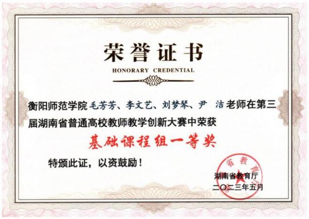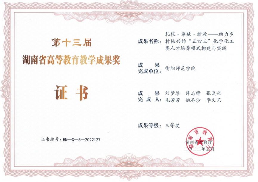 教学研究改革:学院以教育教学改革研究项目为载体,将项目申报与教学成果奖的培育相结合,基于成果导向,反向设计,凝练方向、组建团队,积极开展有组织教研活动。近5年学院教师立项省级及以上教育教学改革研究项目14项,发表教改论文32篇;刘梦琴教授主持的教学改革成果“扎根·奉献·绽放 —助力乡村振兴的“五四三”化学化工类人才培养模式构建与实践”获第十三届湖南省高等教育教学成果三等奖。