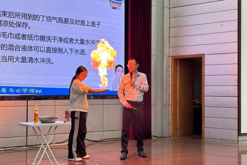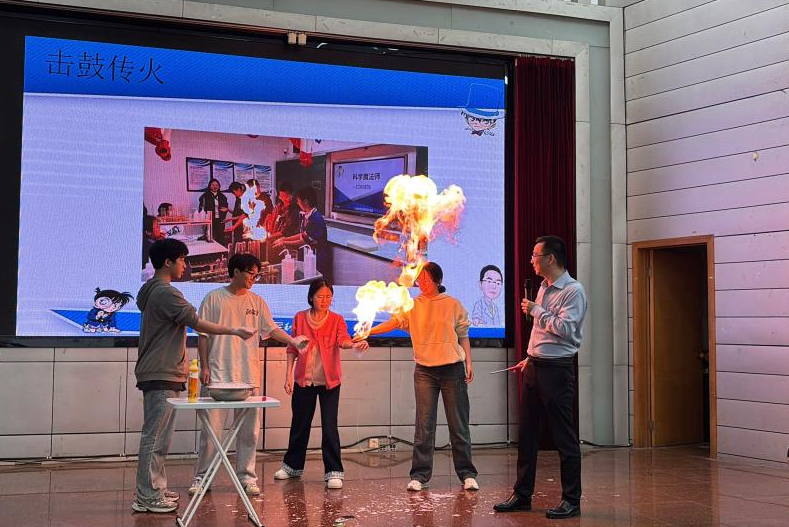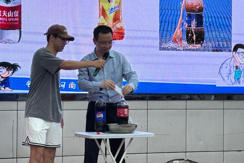随后,中南大学徐海教授以歌曲《泡沫》为切入点为大家带来一场科学主题报告。他先邀请了学生与老师共同演唱歌曲《泡沫》,瞬间拉动了现场的氛围。在报告中,教授通过与学生们一起参与可乐喷泉、火焰神掌、击鼓传火实验,将其中蕴含的科学知识与魔法般的化学现象相结合,深入浅出地展开讲解。他带领同学们揭开“泡沫”背后的科学奥秘,让复杂的科学知识变得妙趣横生。现场观众全神贯注,不时为神奇的科学现象发出阵阵惊叹。在答疑解惑环节中,同学们热情高涨,纷纷提出了自己的疑惑与想法。徐海教授耐心细致地一一回答,与观众进一步展开深入交流。他的讲解不仅让同学们领略了科普教育的魅力,更为PA视讯平台师范生的成长指明了方向。