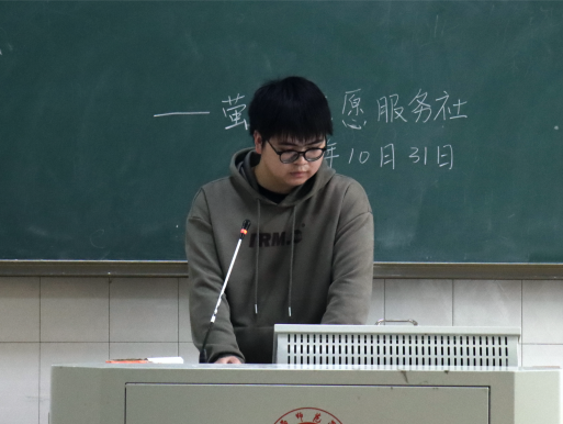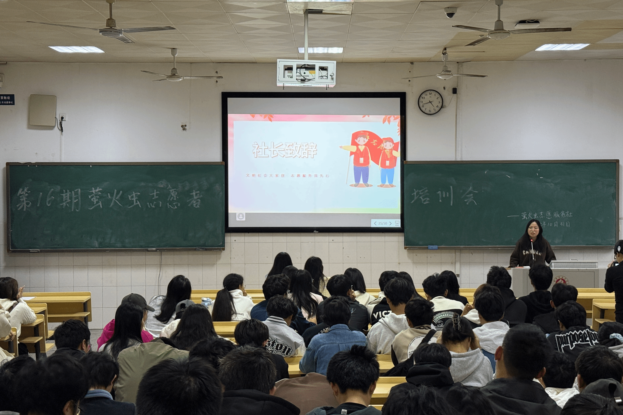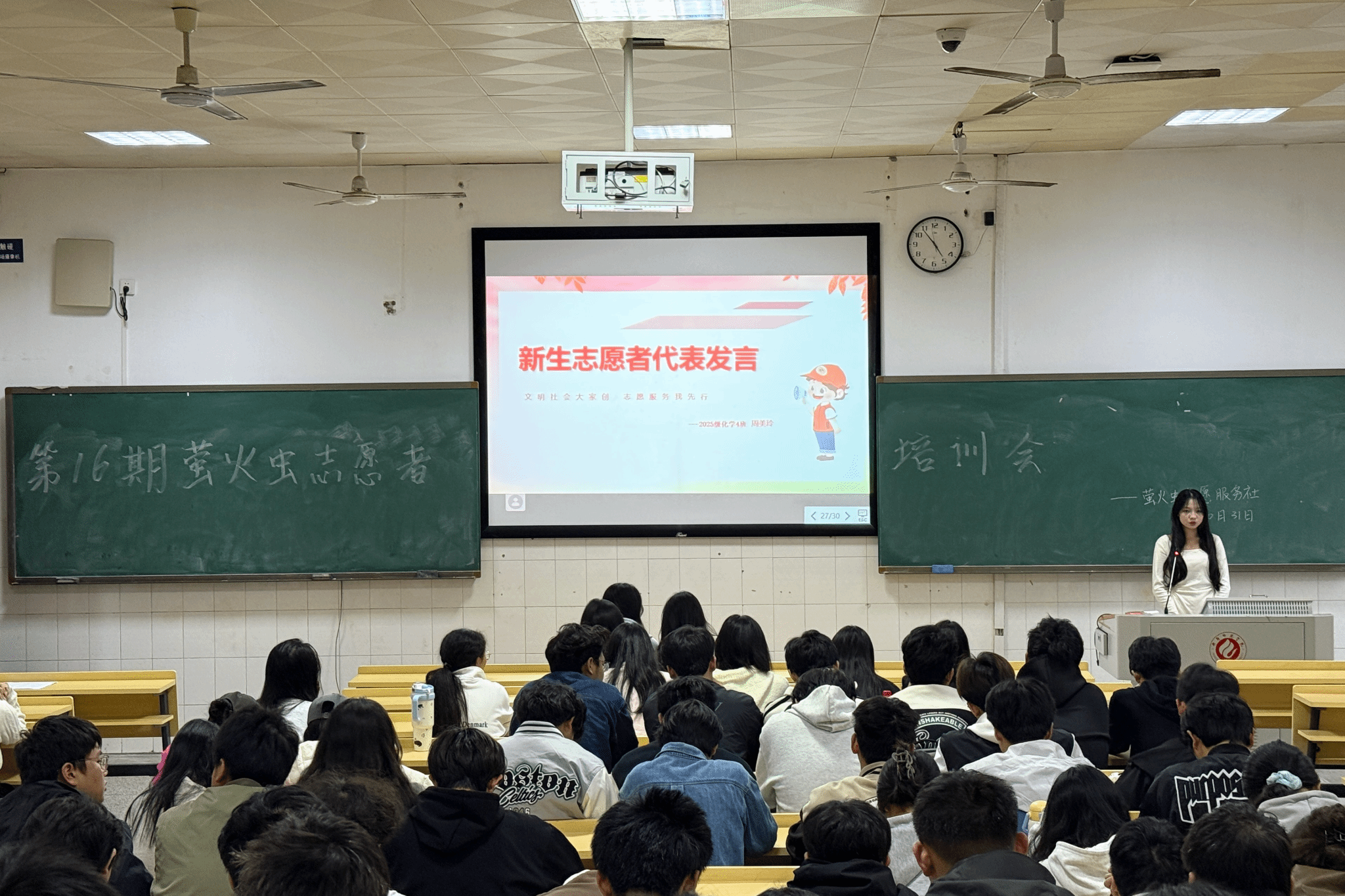 在主讲人深入讲解之后,萤火虫志愿服务社社长周彬彬与社会实践部部长龙宇萍相继登台发言。部长龙宇萍满脸热忱,首先对所有新进志愿者的加入表示热烈欢迎,用真挚的话语让新人感受到社团的温暖氛围。随后,社长周彬彬结合社团过往的志愿服务经历,分享了志愿服务中 “传递温暖、助力他人”的核心理念,鼓励新进志愿者们将奉献精神融入日常服务,在实践中践行志愿初心,为社团的志愿服务事业注入新活力,现场氛围在社长的带动下愈发热烈。