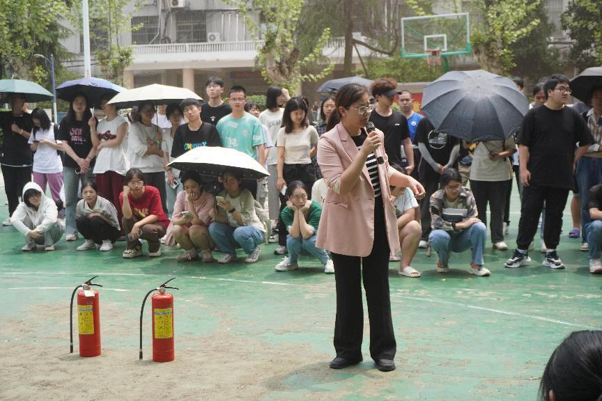 到达室外篮球场后,保卫部尹明老师教育大家要学习相关的消防知识、了解不同的灾害预警,告诉同学们不管发生什么灾害都要按照建筑物内的消防疏散标志迅速有序地往外撤离。同时,他还告诉同学们要先保证自身生命安全的前提下,在火势可控的范围内,可以运用相关的消防知识去灭火和营救他人。此外,他还为大家讲解了灭火器的正确用法,并让同学们现场示范灭火器的使用方法。