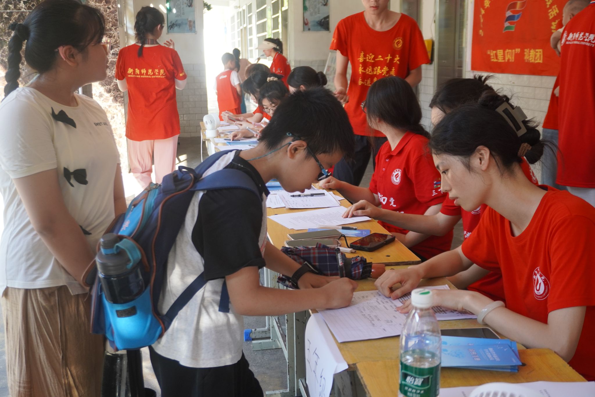 7月15日清晨,安静的校园瞬间热闹起来,村民们带着孩子走进衡南县近尾洲联合学校中心小学校园,前来报名参加衡阳师范学院“红星闪闪”科教团的科学启蒙训练营活动,志愿者们热情迎接每一位陆续到来的村民。今年已是团队来到这里的第八年,为点燃乡村少年的科学梦想,提高村民的生态环保意识和科学素养,团队师生一行43人计划开展为期十天的科普志愿服务活动。