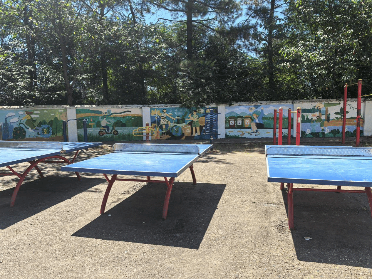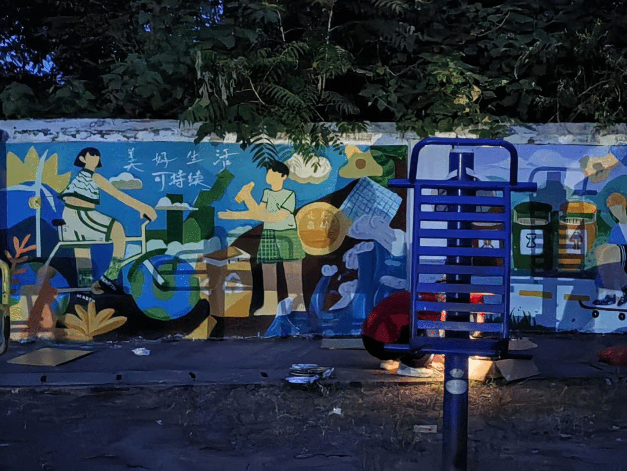 在校园的一角,有一段30余平米的《美好生活可持续》墙体彩绘,节约用水、垃圾分类、光盘行动、绿色出行等生态环保元素成为了团队创作的灵感源泉。为了给孩子们呈现出一幅生动美丽的画卷,团队成员在指导老师唐波湘的带领下,每天6点便开始工作,刷底、勾勒、上色,每一道程序都一丝不苟。为了达到完美的效果,让细节更精彩,队员们常常挑灯夜战。就这样历经8天,原来单调的校园围墙焕发出勃勃生机,绿色清新的画面、憨态可掬的人物吸引了孩子们驻足观看。团队还开展了《心中的地球》《垃圾分类》和《妙趣时光》趣味环保手工等美术课,让生态环保理念走进课堂,引导孩子们在艺术创作中,发挥想象力和创造力,描绘出天蓝、山清、水秀的美丽家园。在环保手工课上,孩子们利用泡沫网、树叶、环保布袋等材料,设计出各种造型的水果、面具、创意帆布袋等作品。在队员们和孩子们的努力下,这些艺术作品皆以展板的形式在校园展出,后期它们还将在团队文艺汇演走秀节目《环保手工 妙趣时光》中被展示。